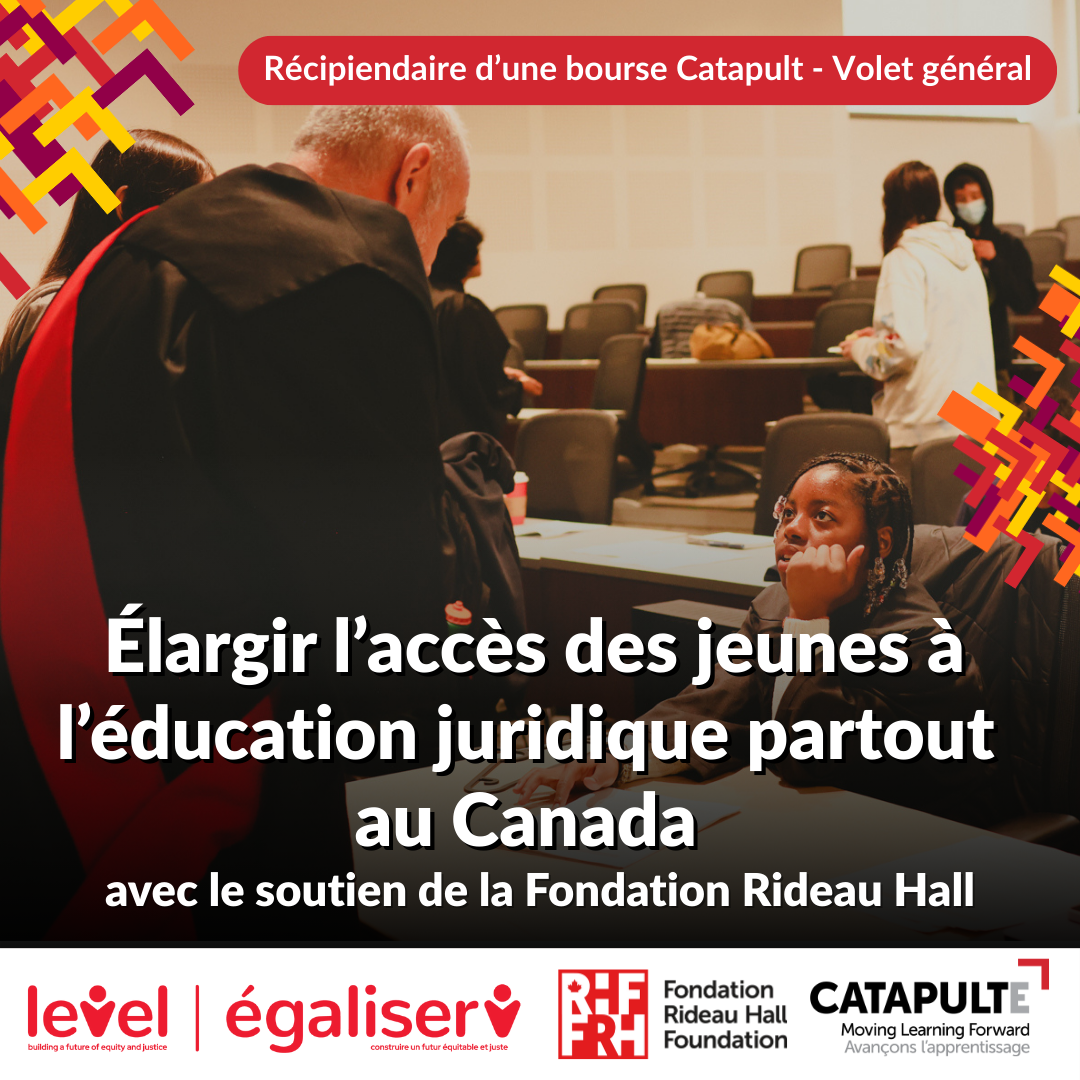 Grâce au soutien du programme Catapulte Canada de la Fondation Rideau Hall, Égaliser pourra accroître sa portée en bâtissant une plateforme numérique nationale qui fera tomber les barrières à l’apprentissage juridique. Le financement de Catapulte permettra aussi à Égaliser de développer le centre conjointement avec des jeunes, de créer du contenu tenant compte des traumatismes et des réalités culturelles, et d’élargir sa portée aux communautés rurales, nordiques et mal desservies.