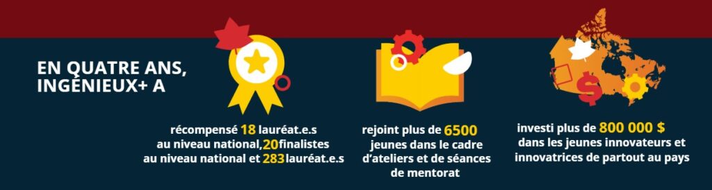 Depuis son lancement, Ingénieux+ a investi plus de 800 000 $ dans de jeunes innovateurs et innovatrices en récompensant 18 lauréat.e.s au niveau national, 20 finalistes au niveau national et 283 lauréat.e.s au niveau régional. Plus de 6 500 jeunes ont participé à des ateliers et à des séances de mentorat qui leur ont permis d’acquérir des compétences en résolution de problèmes, en leadership et en entrepreneuriat.